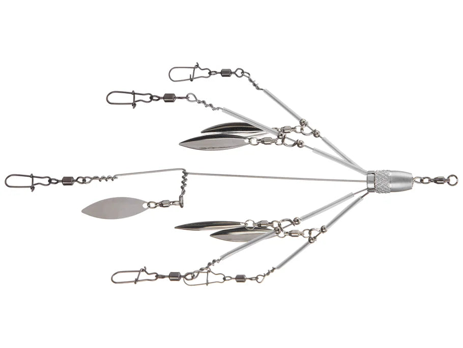 Delivering maximum flash with five premium willow blades, the Shane's Baits The 5th Element Umbrella Rig will call fish in from across the lake! The 5th element employs the same hardware and innovative construction as the rest of the Shane’s Baits lineup, however it adds an additional willow blade anchored to the center stainless steel arm to better imitate a densely packed school of baitfish. Leading the rig is a military grade aluminum head that is turned on the most precise Swiss machines to ensure impeccable balance while still allowing wiggle room for the stainless steel arms to increase their durability.